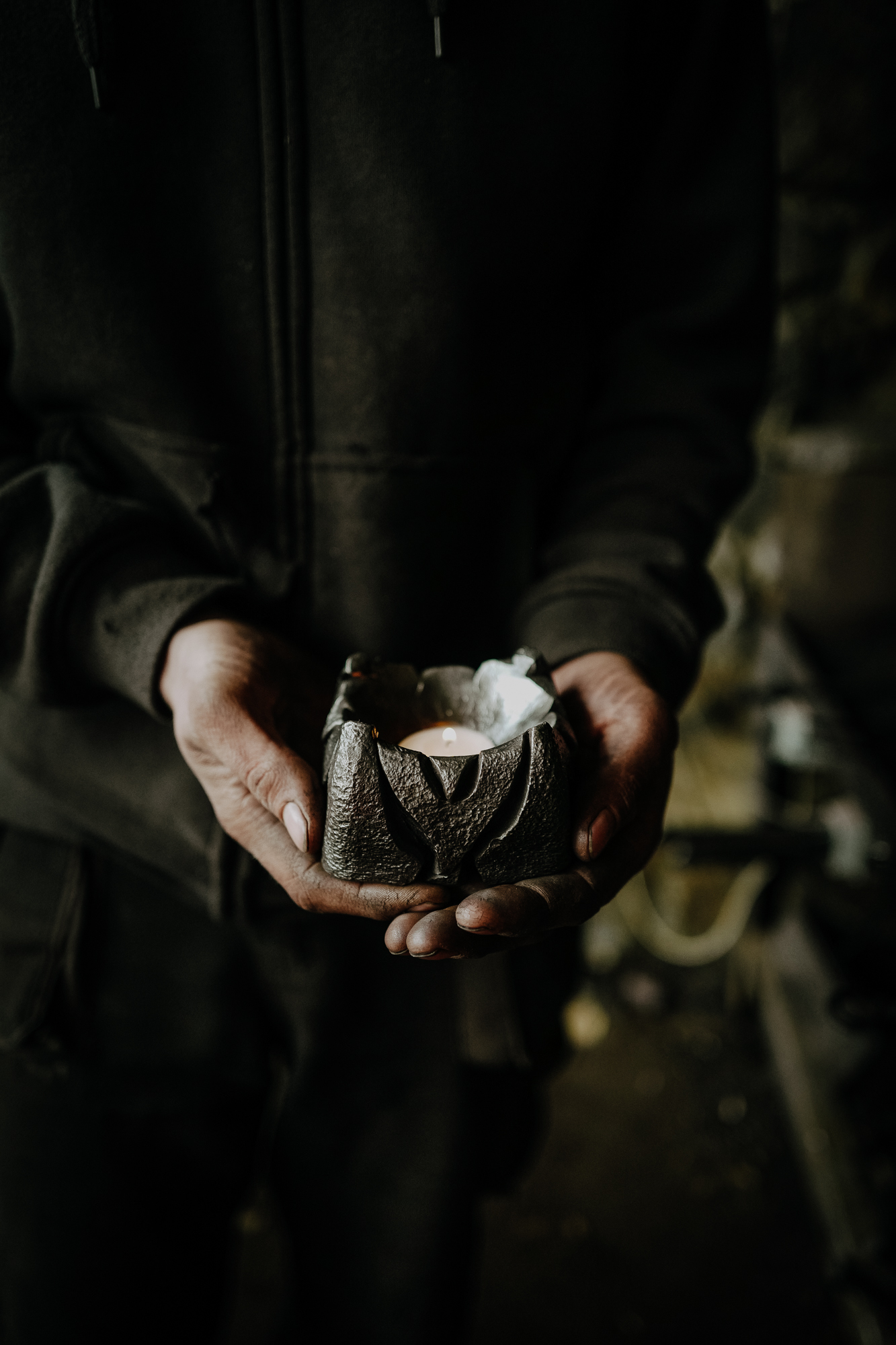 Ručně kovaný svícen na jednu čajovou svíčku vhodně doplní vaši domácnost. Základem je ocelový profil o rozměru 50×50 mm, který je pěchováním a sekáním upraven do cílového tvaru.